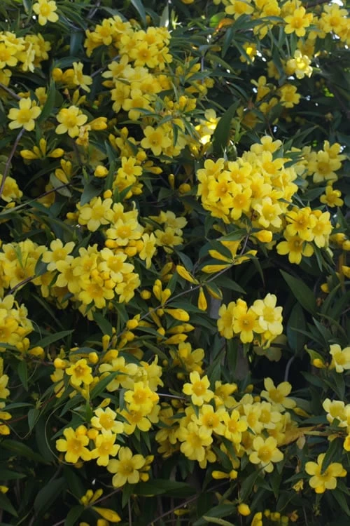 Jasmine Duet is a combination of two species of magnificent climbing vines: Gelsemium rankinii and Gelsemium sempervirens, both of which are jasmines, also called Jessamine. Jasmine Duet features an abundant and spectacular display of fragrant, funnel-shaped, bright yellow flowers against dark green foliage in late winter into spring and then reblooms in fall. The vine is evergreen in USDA Zone 8a but may be semi-evergreen to deciduous in zones further north. Excellent for growing on a trellis, arbors, fences and walls and can also be used in mass plantings as an attractive groundcover.