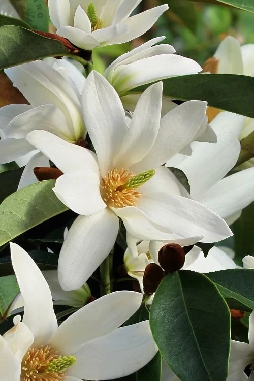 The Fairy White Magnolia is very easy to grow in most any moist but well-drained soil of average fertility. It prefers an acid to neutral soil ranging from 5.0 to 7.0 on the pH scale. It grows well in full sun or part shade. We suggest at least 4 hours of direct sunlight per day for best flowering and foliage density. Very heat and humidity tolerant. We’ve noticed in our hot and humid north-central Georgia gardens that the foliage is darker green in filtered sun during the midafternoon hours. No pruning is necessary, however as the plant grows taller lower branches can be removed to a desired height to form a small tree.