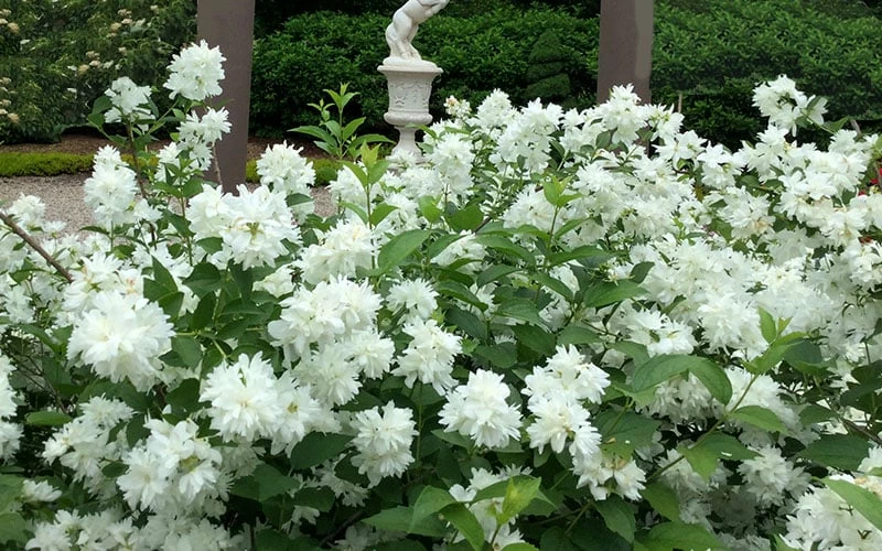 Cherished for its wonderful fragrance and old-fashioned look and appeal, the Minnesota Snowflake Mock Orange features a plethora of wonderfully fragrant white flowers in late spring to early summer that nearly cover the shrub, filling the garden with delightfully sweet aroma. The flowers are fully double, hence “snowflake” in the name. It forms a densely-branched, upright vase shaped shrub 6 to 8 feet tall and 5 to 6 feet wide clothed in lush, medium to dark green leaves that hold their color all the way through fall. An excellent addition to the flowering shrub border or as an accent or hedge around the home and outdoor living spaces where the pretty flowers and fragrance can be enjoyed from close up. This sensory beauty is one that will always have you looking forward to its bloom.